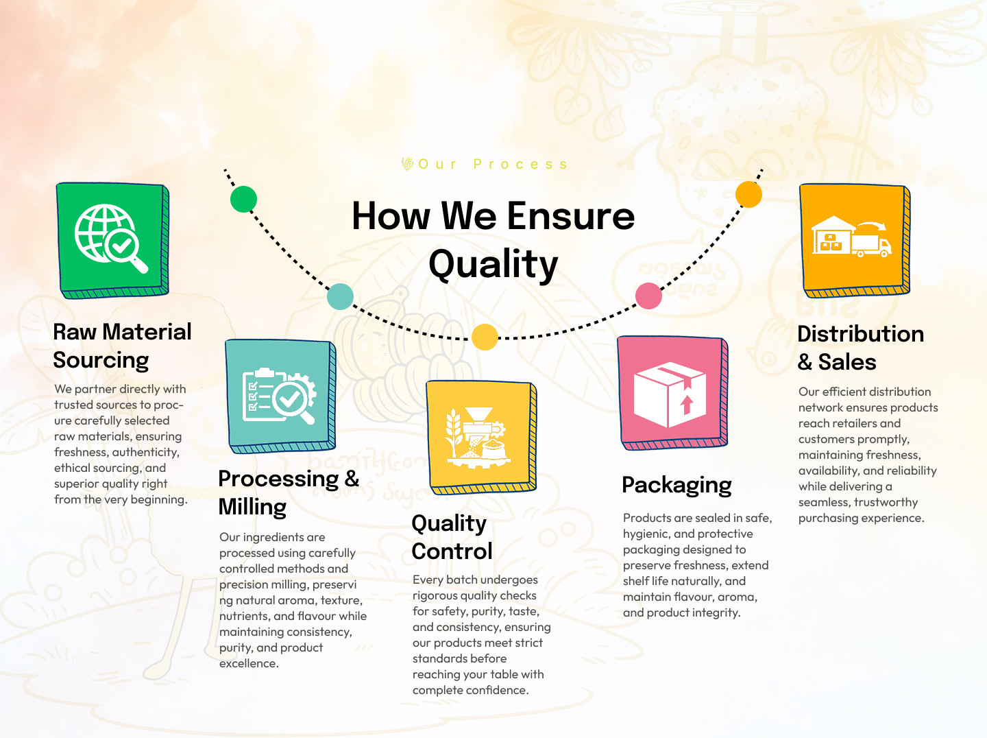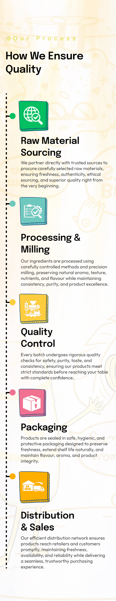 Carefully sourced raw materials, crafted with handmade care at scale, we ensure purity, freshness, clean ingredients, consistent quality, and honest food made without shortcuts or compromises.